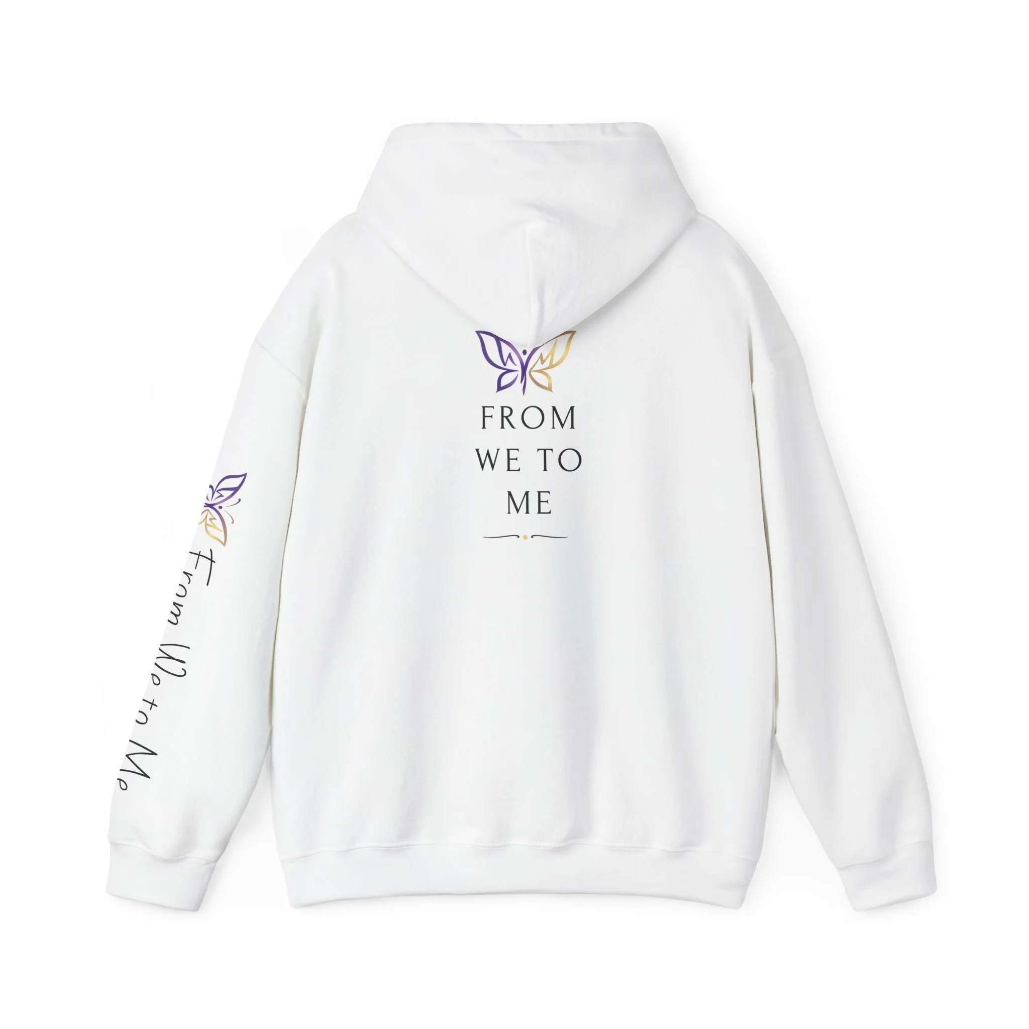 Soft, roomy, and quietly empowering — this hoodie wraps you in comfort while carrying a gentle reminder to choose yourself. The smooth 50/50 cotton-poly blend holds the delicate, watercolor-like butterfly print in rich purple-to-gold tones. Front chest shows a minimal, elegant butterfly; the back repeats the motif above the words “FROM WE TO ME,” a subtle mantra for anyone practicing clearer boundaries, self-care, or personal growth. The double-lined hood and color-matched drawcord keep the silhouette clean and durable. Wear it between errands, layered for chilly morning walks, or around the house when you need a calm, steady reminder to put your own needs first.