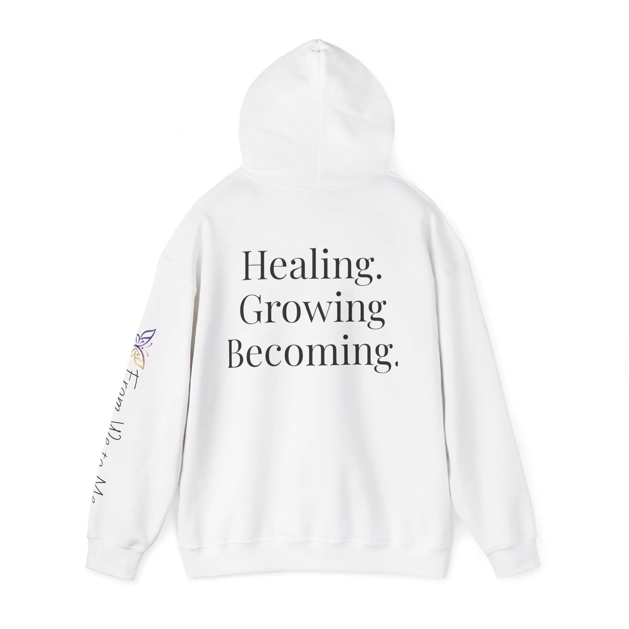 Soft, roomy, and quietly empowering — this hoodie wraps you in comfort while carrying a gentle reminder to choose yourself. The smooth 50/50 cotton-poly blend holds the delicate, watercolor-like butterfly print in rich purple-to-gold tones. Front chest shows a minimal, elegant butterfly; the back repeats the motif above the words “FROM WE TO ME,” a subtle mantra for anyone practicing clearer boundaries, self-care, or personal growth. The double-lined hood and color-matched drawcord keep the silhouette clean and durable. Wear it between errands, layered for chilly morning walks, or around the house when you need a calm, steady reminder to put your own needs first.